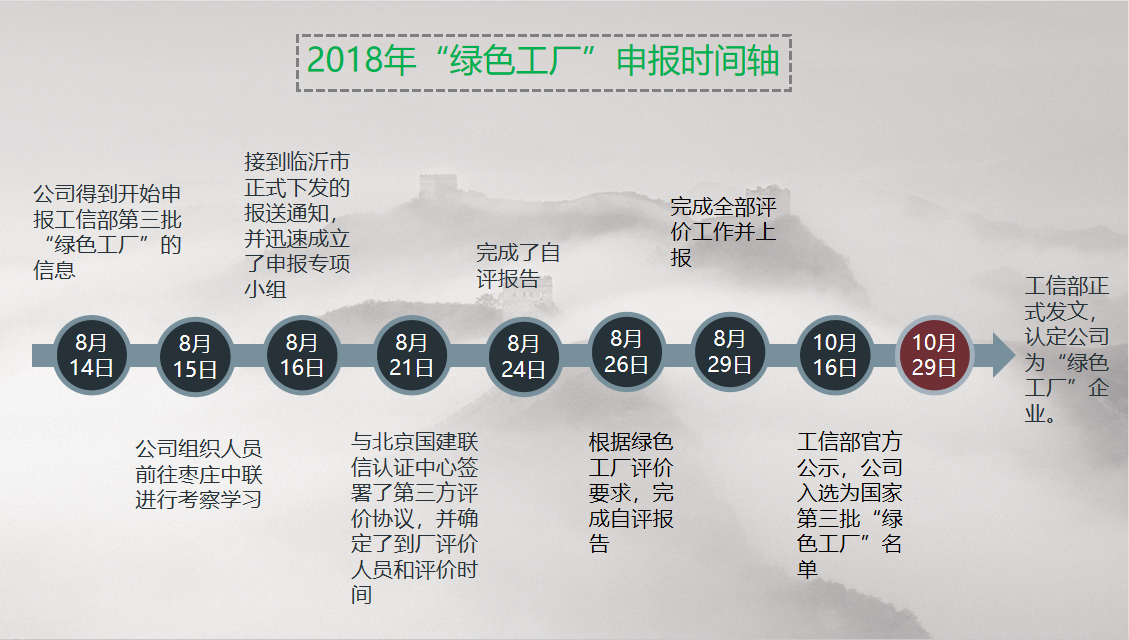 2018年8月14日,在得到開始申報工信部第三批“綠色工廠”的信息后,公司領(lǐng)導(dǎo)一致決定參加本次申報。8月16日,公司接到臨沂市正式下發(fā)的報送通知。在與蘭陵縣節(jié)能辦溝通后,得到了縣級和市級相關(guān)單位的支持和認(rèn)可,由此開始著手準(zhǔn)備具體的申報事宜。